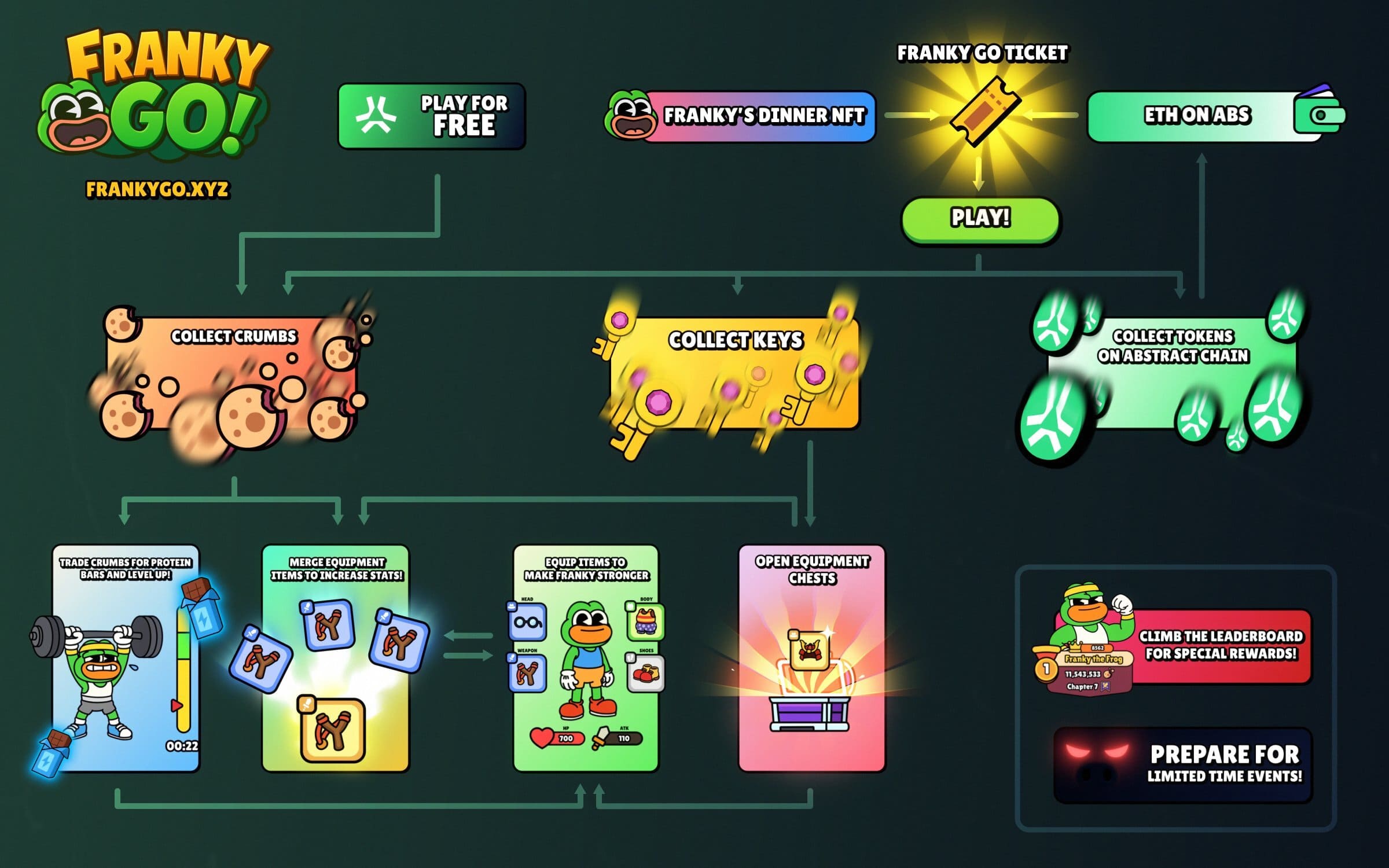 Trong mỗi lượt chơi, mục tiêu là sống sót trong 10 ngày bằng cách đưa ra các lựa chọn chiến thuật và chiến đấu trong những trận chiến 2D nhàn rỗi để giành Crumbs, Khóa Trang Bị, Rương Trang Bị và các crypto meme token trên Abstract. Nhân vật chính là chú ếch Franky, sẽ dẫn bạn vào những cuộc phiêu lưu đầy màu sắc nhưng không kém phần nguy hiểm. Trên hành trình, bạn sẽ gặp đủ loại tình huống bất ngờ: từ việc quyết định có nên mở một chiếc rương bí ẩn với rủi ro mất máu để đổi lấy vật phẩm giá trị, cho đến những sự cố ngẫu nhiên như bị ong tấn công hay gặp bóng đen đáng ngại trong rừng. Yếu tố RNG đóng vai trò lớn trong trò chơi, và bạn càng chơi nhiều thì khả năng nâng cấp bản dựng để sống sót lâu hơn càng cao.