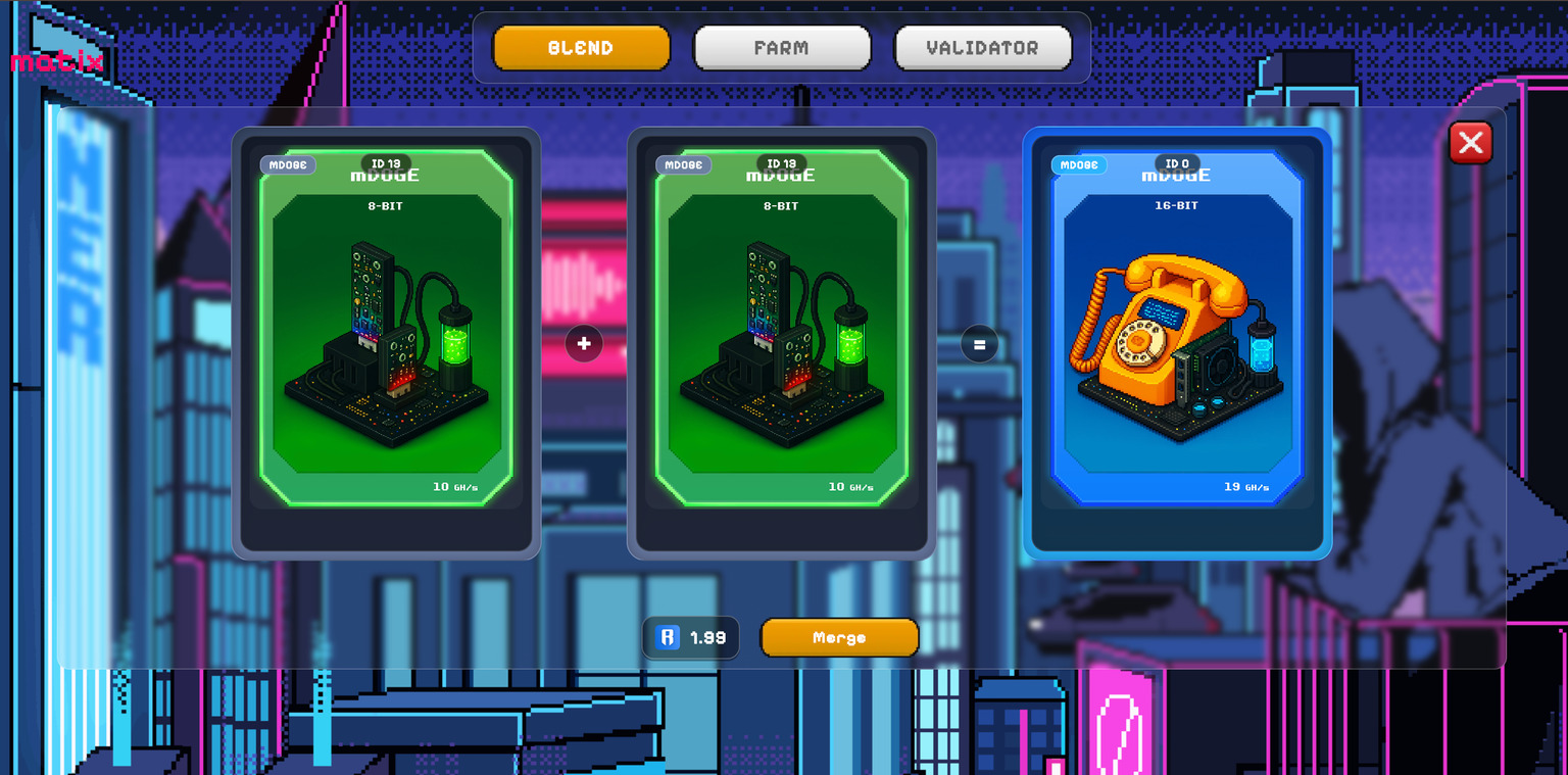Để kiếm thêm điểm, bạn cũng có thể " pha trộn " 2 NFT giống nhau để có được một NFT tốt hơn. Vì vậy, nếu bạn có 2 NFT cùng loại và độ hiếm, bạn có thể pha trộn chúng để biến đổi thành một NFT mới có độ hiếm cao hơn, với số điểm trên bảng xếp hạng được trao sẽ khác nhau tùy thuộc vào độ hiếm tương ứng. Bạn có thể làm điều này với Thợ mỏ và Bản thiết kế, trong đó Bản thiết kế là các NFT đặc biệt được sử dụng để kết hợp Thợ mỏ để tạo ra Nông trại.
